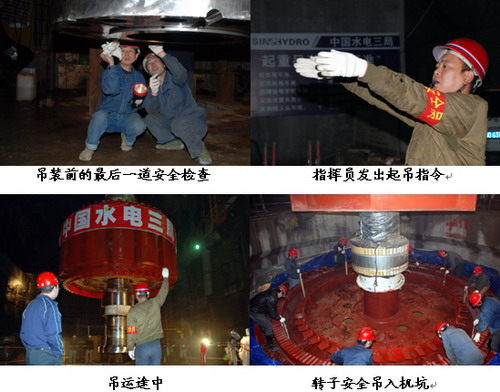 9∶40時(shí)轉(zhuǎn)子開始起吊,經(jīng)過55分鐘的緊張工作,1#發(fā)電機(jī)轉(zhuǎn)子于10∶35時(shí)成功吊入機(jī)坑。