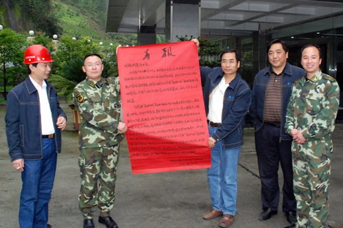 公司副總經(jīng)理王新(右三)從安蓉公司項(xiàng)目經(jīng)理黃永貴(左二)手中接過(guò)喜報(bào)。