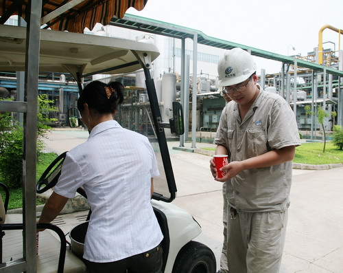 三是堅持“以人為本”,加大防暑降溫的資金投入,不斷改善員工工作環(huán)境,加強后勤保障工作。為了給現(xiàn)場一線操作人員送去夏日清涼,公司為6號廠房配置露天太陽傘,有效減少了陽光直射,降低溫度;將閑置空調(diào)安裝到現(xiàn)場精餾工段休息室。為防止員工中暑,公司為員工發(fā)放藿香正氣水及人丹防暑降溫藥品,每天為一線各崗位運送清涼飲料。