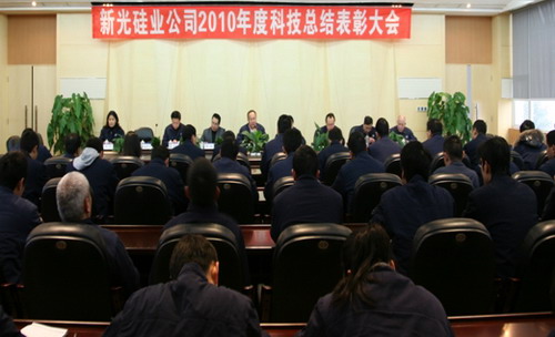 “科技就是生產(chǎn)力。”新光硅業(yè)公司自成立以來,高度重視科研開發(fā)和科技創(chuàng)新。2011年1月6日,公司召開2010年度科技大會,樂山市科技局領導、公司領導、專家、各部門負責人、科研課題組負責人以及公司科技人員參加了會議,會議由公司副總經(jīng)理鐘志翔主持。