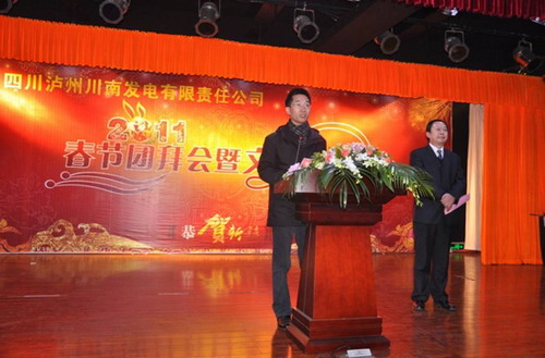 晚7:00,團(tuán)拜會(huì)開始。會(huì)議由黨委書記唐得旗主持,他提前向大家拜年,祝大家闔家安康,萬事如意。總經(jīng)理李勝章作了熱情洋溢的新春致辭。李總在講話中回顧了公司2010年的主要工作和取得的成績(jī),他說:2010年是公司機(jī)組投產(chǎn)以來生產(chǎn)任務(wù)最重、檢修項(xiàng)目最多、技改任務(wù)最緊、環(huán)保壓力最大的一年,又是機(jī)組非停次數(shù)最少、成本控制最好、執(zhí)行力最強(qiáng)、全體員工最?yuàn)^進(jìn)、最給力的一年。對(duì)職工的無私奉獻(xiàn),李總代表公司表示衷心感謝,并向全體職工和家屬致以最誠摯的節(jié)日問候和祝福。對(duì)于今年,李總強(qiáng)調(diào):2011年,是實(shí)施“十二五”規(guī)劃的開局之年,也是公司徹底打破環(huán)保瓶頸制約、開創(chuàng)發(fā)展新局面的關(guān)鍵之年。公司將以安全生產(chǎn)為基礎(chǔ),市場(chǎng)營(yíng)銷為導(dǎo)向,深入推進(jìn)節(jié)能減排,全方位開展成本控制,完成#1機(jī)組脫硫技改,確保全年發(fā)電50億千瓦時(shí)。他號(hào)召公司全體職工攜手共進(jìn),以更加飽滿的熱情、更加務(wù)實(shí)的態(tài)度、更加昂揚(yáng)的斗志,共同譜寫川南發(fā)電公司“十二五”炫麗的開局篇章!
