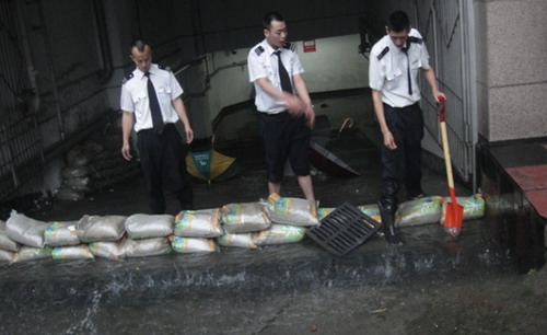 “七.三”強降雨時,南府項目出現(xiàn)從地下車庫進口坡道處和消防轉(zhuǎn)接器管道處向地下車庫內(nèi)漏水的緊急情況,積水威脅車庫和配電室安全。值班經(jīng)理汪秀云果斷指揮當(dāng)班人員分頭通知車主,把停放在地下車庫內(nèi)的轎車迅速轉(zhuǎn)移到庫外安全地點,再指揮秩序維護員、環(huán)境維護員和設(shè)備維養(yǎng)員用沙袋在車庫坡道外和配電房門口壘砌擋水墻,啟動潛水泵和組織人力不斷排水,防止積水進入配電房,同時將現(xiàn)場情況報告項目經(jīng)理。項目經(jīng)理周道久也一邊電話指揮,一邊用最快速度趕到了現(xiàn)場指揮排險,確保了南府項目未發(fā)生任何事故。
