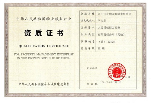 2012年12月3日,四川佳友物業(yè)有限責(zé)任公司正式獲得由國(guó)家住建部頒發(fā)的物業(yè)服務(wù)企業(yè)一級(jí)資質(zhì),標(biāo)志著佳友物業(yè)的服務(wù)水平已經(jīng)得到了行業(yè)主管部門(mén)和市場(chǎng)的廣泛認(rèn)可,不但掃清了市場(chǎng)運(yùn)作和項(xiàng)目發(fā)展方面的障礙,也為躋身于全省先進(jìn)物業(yè)管理企業(yè)行列奠定了堅(jiān)實(shí)的基礎(chǔ)。
