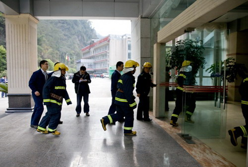 情況緊急,值班人員接到報(bào)警后立即向火災(zāi)事故應(yīng)急辦公室技術(shù)與安全部負(fù)責(zé)人報(bào)告,爾后又層層向公司現(xiàn)場(chǎng)值班領(lǐng)導(dǎo)、公司總經(jīng)理報(bào)告??偨?jīng)理指示立即成立火災(zāi)事故應(yīng)急救援指揮部,現(xiàn)場(chǎng)由熊宇負(fù)責(zé)指揮。按總指揮要求,現(xiàn)場(chǎng)指揮長(zhǎng)命令:拉響警報(bào)器,啟動(dòng)火災(zāi)事故二級(jí)應(yīng)急響應(yīng),疏散組快速組織接待中心大樓人員安全撤離,滅火行動(dòng)組立即組織兼職消防隊(duì)員、義務(wù)消防隊(duì)員投入滅火戰(zhàn)斗......一道道緊急命令從指揮部發(fā)出,各應(yīng)急救援小組快速集結(jié),按公司火災(zāi)事故應(yīng)急預(yù)案有序開(kāi)展救援行動(dòng)。