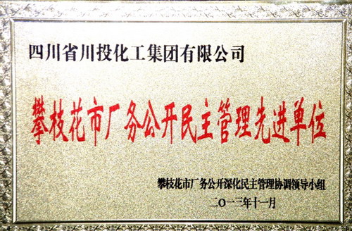 2013年11月26日,攀枝花市廠務公開民主管理總結(jié)暨推進表彰會在攀枝花市工人文化宮舉行。四川省川投化學工業(yè)集團有限公司榮獲攀枝花市廠務公開民主管理先進單位,總經(jīng)理王少甫同志榮獲廠務公開民主管理先進個人。