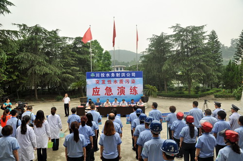 “報(bào)告梁總,四川川投水務(wù)集團(tuán)射洪有限責(zé)任公司突發(fā)性水質(zhì)污染應(yīng)急演練各項(xiàng)工作準(zhǔn)備就緒,請(qǐng)指示。”