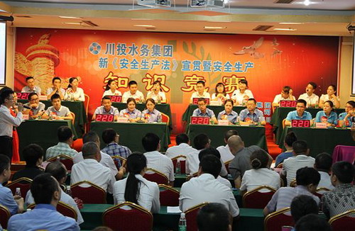 6月是全國(guó)安全生產(chǎn)月。為深入貫徹落實(shí)2015年安全生產(chǎn)月“加強(qiáng)安全法治,保障安全生產(chǎn)”主題精神,2015年6月24日上午,川投水務(wù)舉辦在宏源公司11樓多功能廳舉辦了新《安全生產(chǎn)法》宣貫暨安全生產(chǎn)知識(shí)競(jìng)賽活動(dòng)。川投集團(tuán)安辦副主任曾明、川投水務(wù)綜合部經(jīng)理?xiàng)钪緞偂踩?wù)監(jiān)察部經(jīng)理馬玉斌、射洪縣安監(jiān)局副局長(zhǎng)趙杰等領(lǐng)導(dǎo)出席知識(shí)競(jìng)賽活動(dòng)。川投水務(wù)各子公司主要領(lǐng)導(dǎo)帶隊(duì)參加比賽。