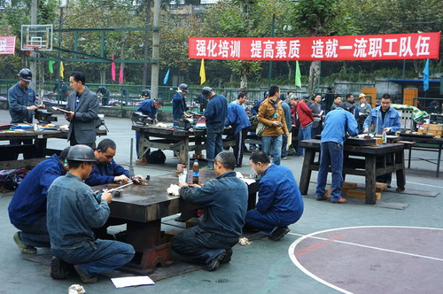 從2005年開始,嘉陽集團每三年進(jìn)行一次考工晉級工作,至今已連續(xù)開展了三屆。凡專職從事主要技術(shù)工種或?qū)B殢氖缕渌夹g(shù)工種且在本崗位工作滿一周年的技術(shù)工人均可以參加考工晉級,原定技術(shù)等級一律只作為資格參考,新一輪考工晉級都要全體起立,重新考評定級??脊x級考試按照理論占35%,實際操作占45%,日常表現(xiàn)占20%的比例進(jìn)行考評,各單位依分?jǐn)?shù)從高到低按設(shè)崗方案自行聘用各等級人員??荚嚨某鲱}、監(jiān)考、閱卷均由成都工業(yè)學(xué)院負(fù)責(zé),理論考試每個工種分別設(shè)A、B兩套考題,考試當(dāng)天現(xiàn)場抽簽決定選用考題,并由監(jiān)審紀(jì)檢科負(fù)責(zé)全過程的監(jiān)督。為了讓此次考工晉級收到預(yù)期效果,嘉陽集團在8月便組織開展了各工種理論培訓(xùn),10月15日集中進(jìn)行了電、鉗、焊三類主要工種考試外,其余工種由各單位自行組織理論考試,并由集團公司人力資源部、監(jiān)審紀(jì)檢科進(jìn)行監(jiān)督抽查。